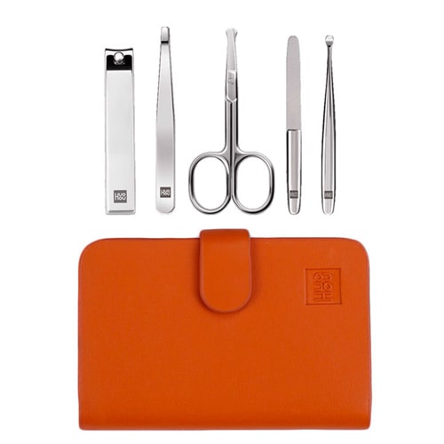 Маникюрный набор компактного размера включает клиппер, маникюрные ножницы, пинцет, лопатку и пилку для ногтей.
